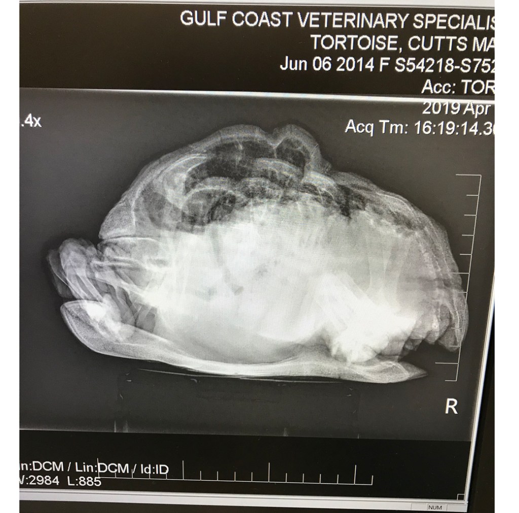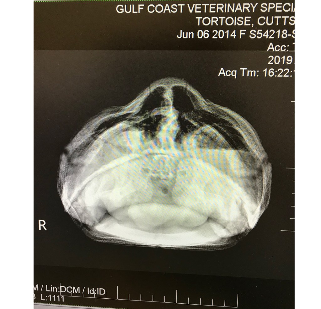 Can you see that strange opaque area right in the center region near her lower shell area? That area isn’t supposed to look like that. Our worried exotic veterinarian took one look at that and requested permission to perform a CT scan (yes, the same exact kind that is used for people medicine – at the exact same high cost).